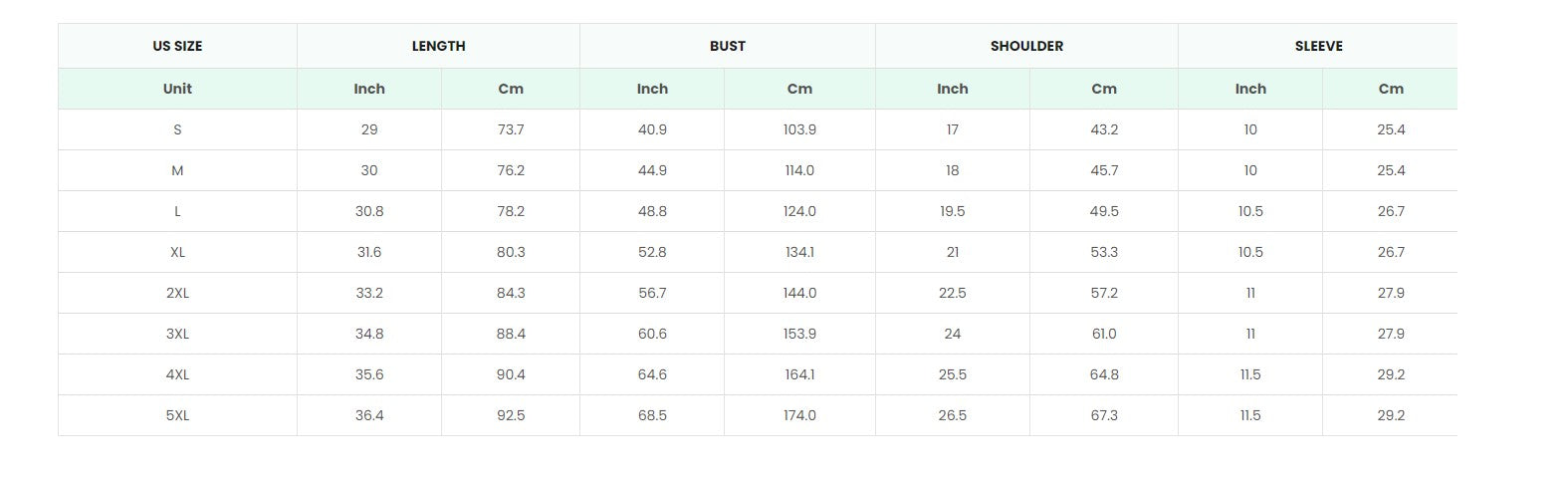 Size chart information: